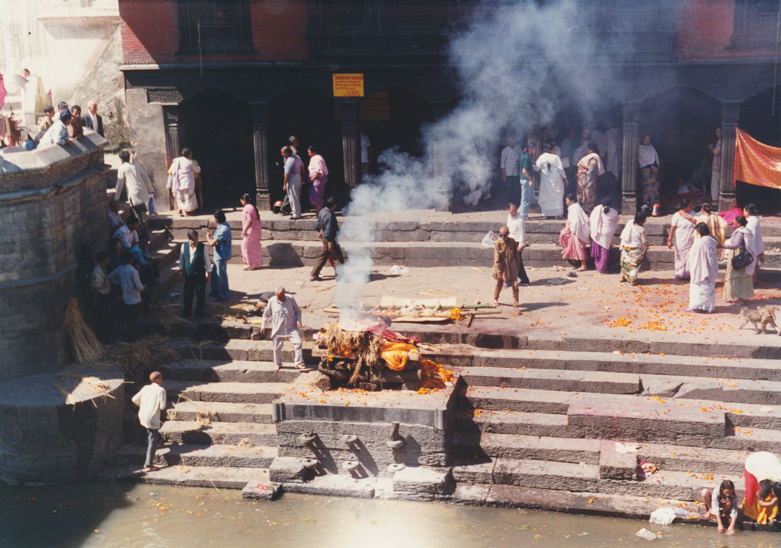 Παρόμοιες εκδηλώσεις γίνονταν και σε άλλους δρόμους του Κατμαντού πηγαίνοντας από τον έναν ναό στον άλλον. Σήμερα, επισκέπτομαι τον ιερό ναό Pashupatinath, στις όχθες του ποταμού Bagmati. Εδώ, βρίσκονται οι πιο σημαντικοί ινδουιστικοί ναοί του Νεπάλ. Ο ποταμός Bagmati θεωρείται ιερός, όπως και ο Γάγγης στην Ινδία. Στην όχθη του ποταμού, κοντά στην κεντρική γέφυρα, υπάρχουν τρεις εξέδρες, στις οποίες γίνεται η καύση νεκρών ανάλογα με τη κάστα τους. Βρέθηκα σε μια τέτοια εκδήλωση και το θέαμα ήταν σοκαριστικό. Ο νεκρός, καλυμμένος με ένα πορτοκαλί σεντόνι και σκεπασμένος με λουλούδια, τοποθετείται πάνω σε έναν λόφο από ξύλα τοποθετημένα με αριστοτεχνικό τρόπο.