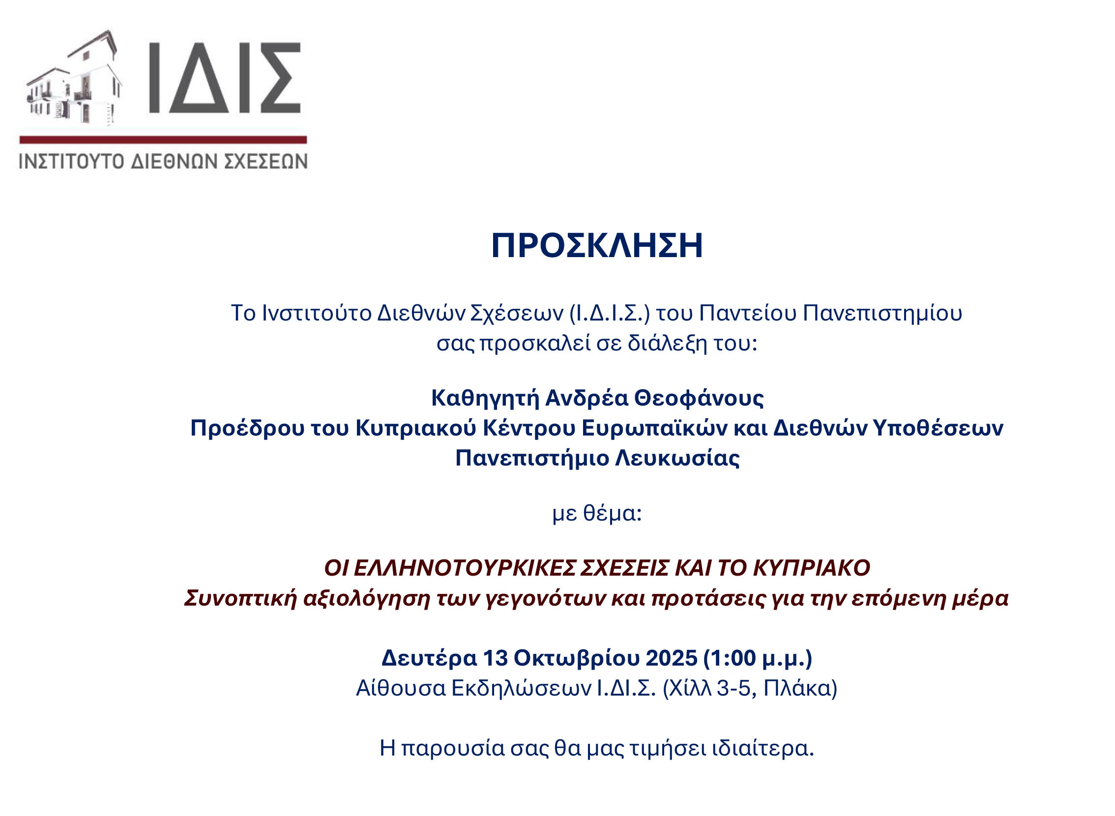 Τριτη Ματια Οι Ελληνοτουρκικές σχέσεις και το Κυπριακό 07/10/2025 Οι Ελληνοτουρκικές σχέσεις και το Κυπριακό – Συνοπτική αξιολόγηση των γεγονότων και προτάσεις για την επόμενη μέρα Δευτέρα 13 Oκτωβρίου 2025 (13:00) Share Facebook X Telegram Linkedin Whatsapp Email Related Posts ΟΗΕ: Για την ανάγκη μιας παγκόσμιας συμμαχίας στην κλιματική αλλαγή μίλησε χθες ο Ελληνας πρωθυπουργός 22/09/2023 Tags Ελληνοτουρκικές σχέσειςΚυπριακό bot Latest Posts Οι Ελληνοτουρκικές σχέσεις και το Κυπριακό 07/10/2025 Βραβείο Νόμπελ για την ανακάλυψη των «φρουρών ασφαλείας» του ανοσοποιητικού συστήματος 07/10/2025 Μετά από δύο χρόνια πολέμου, τι ακριβώς έχει κερδίσει η Χαμάς; 07/10/2025 Αίγυπτος: Ανοικτός για το κοινό ένας από τους πιο εμβληματικούς τάφους Φαραώ στην Κοιλάδα των Βασιλέων 07/10/2025 Categories Life & Art471 Mονόλογοι με τον`Αγγελο Πετρουλάκη4 Podcast & Youtube67 Private View Με την`Ιριδα Κρητικού43 Ritsmas Corner767 Ανυπερθετως48 Αποχρωσεις784 Αρθρογράφοι112 Γεωπολιτική3 Διεθνη401 Επικαιροτητα438 Ιστορία595 Κοινωνια198 Μουσικες Εμπειριες με την Εφη Αγραφιωτη91 Ο καρδιολόγος Θανάσης Δρίτσας σχολιάζει επίκαιρα ζητήματα υγείας1 Παυσιλυπα & Παυσιπονα με τον Θαναση Δριτσα96 Περιβαλλον113 Πολιτισμος643 Προβολεις469 Προσανατολισμοι65 Προσωπα430 Σκαλίζοντας το χθες στον ελληνικό τύπο με την Χριστίνα Φίλιππα19 Συνεντευξεις22 Ταξίδια48 Το official κανάλι του artpointview.gr στο YouTube53 Το Ποίημα της Ημέρας30 Τριτη Ματια521 Υγεια149 Previous Story Βραβείο Νόμπελ για την ανακάλυψη των «φρουρών ασφαλείας» του ανοσοποιητικού συστήματος Latest from Τριτη Ματια Ο φιλελευθερισμός στους έσχατους καιρούς (*) PeopleCert – ΣΥ.Ρ.Κ.Ι.: Ενισχύοντας την Εκπαίδευση στην Πόλη, Χτίζοντας το Μέλλον της Ομογένειας Η Φιλία στο Σχολείο: Το Μάθημα που μένει Χιλιάδες κόσμου γιόρτασαν τα 250 χρόνια από τη γέννηση της Jane Austen (εικόνες) Γιατί δεν ξεχνάμε το πρώτο φιλί