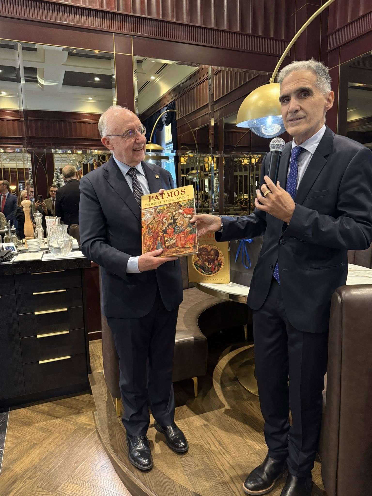Κατά τη διάρκεια της βραδιάς, ο Πρέσβης προσέφερε στον απερχόμενο Πρόεδρο του ICAO ένα λεύκωμα με εικόνες από το Σπήλαιο της Αποκάλυψης και την Ιερά Μονή του Αγίου Ιωάννη του Θεολόγου, ως ένδειξη σεβασμού και πολιτιστικής προσφοράς για τα έξι χρόνια που υπηρέτησε στον Διεθνή Οργανισμό Πολιτικής Αεροπορίας του ΟΗΕ.