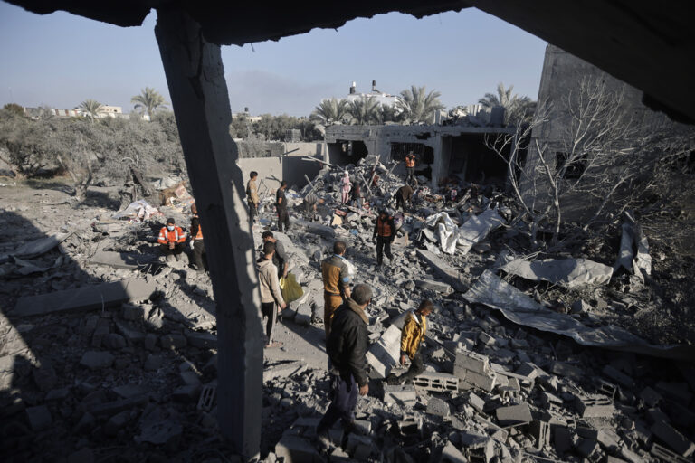 Palestinians inspect the damage of a destroyed house following Israeli airstrikes on Khan Younis, Southern Gaza Strip, Sunday, Dec. 31, 2023. (AP Photo/Mohammed Dahman)