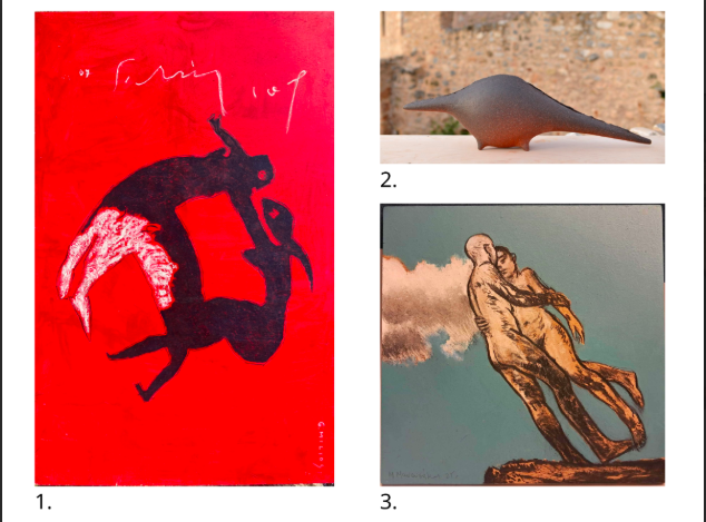 1. George Milios, “Untitled”, Acrylics on Wood, 165×120 cm 2. Voula Gounela, “ΠΡΩΤΟΖΩΟ” , Stoneware Clay, 23x75x14 cm, 2013 3. Michalis Manousakis, “Untitled”, Acrylics and Coal on Wood, 50×45 cm, 2025