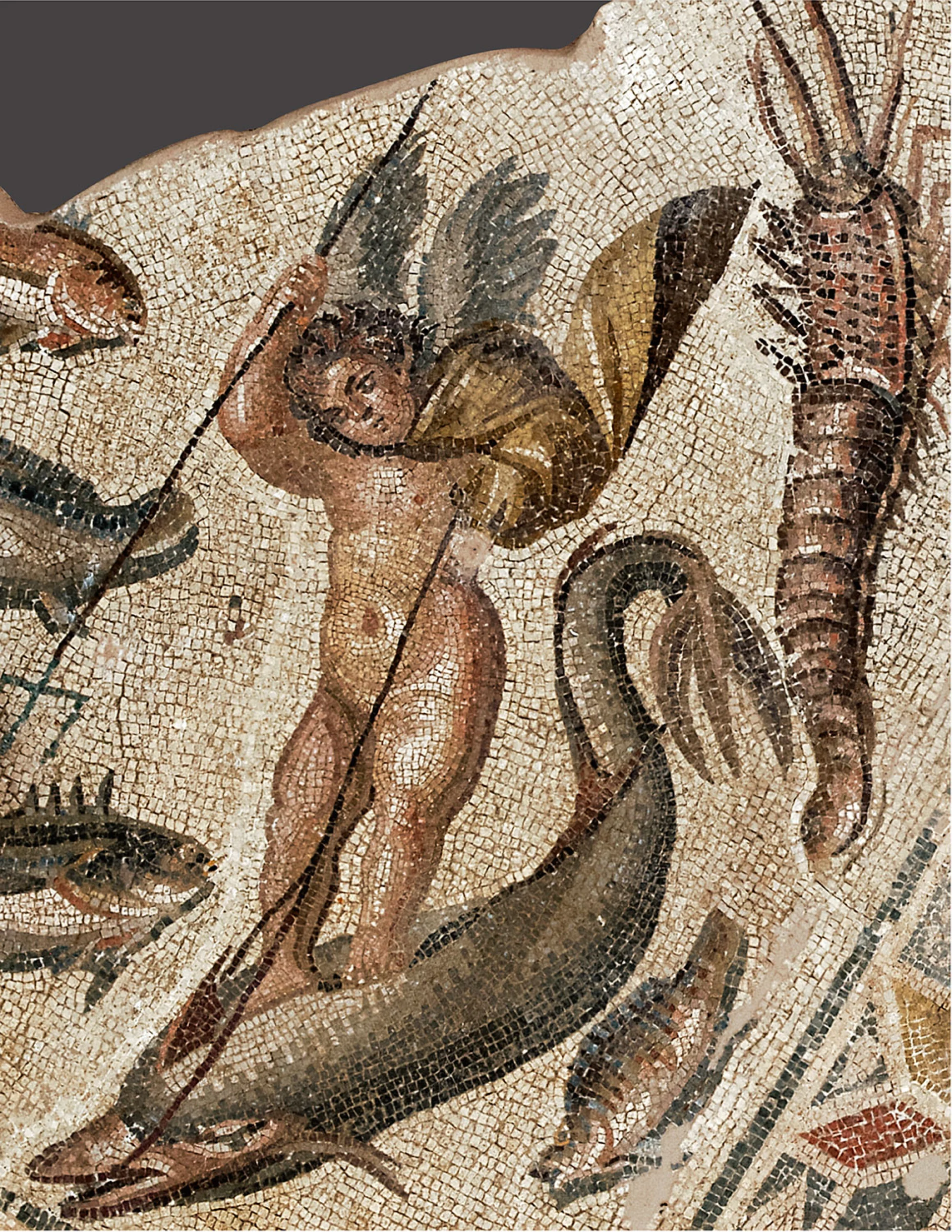 Εξαιρετικής τέχνης ψηφιδωτό δάπεδο από αίθριο ρωμαϊκής οικίας, με απεικόνιση θαλάσσιου κόσμου και με Ερωτιδείς ως αλιείς ψυχών στην υπηρεσία της Αφροδίτης. Πάτρα, 2ος-3ος αι. μ.Χ. © Lamda Development