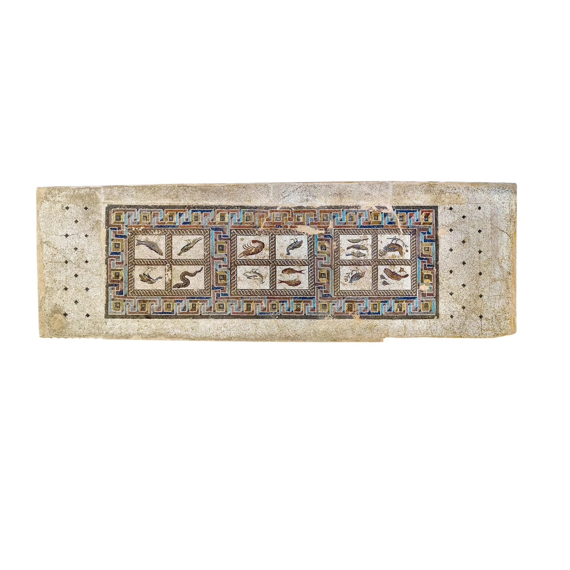 Ψηφιδωτό δάπεδο με πολύχρωμο μαίανδρο που δημιουργεί τρία πλαίσια. Στο καθένα εικονίζονται ψάρια, οστρακοειδή και πτηνά που αποδίδονται με ιδιαίτερες λεπτομέρειες χάρη στη χρήση μικρών ψηφίδων. Πάτρα, 3ος αι. μ.Χ. © Lamda Development
