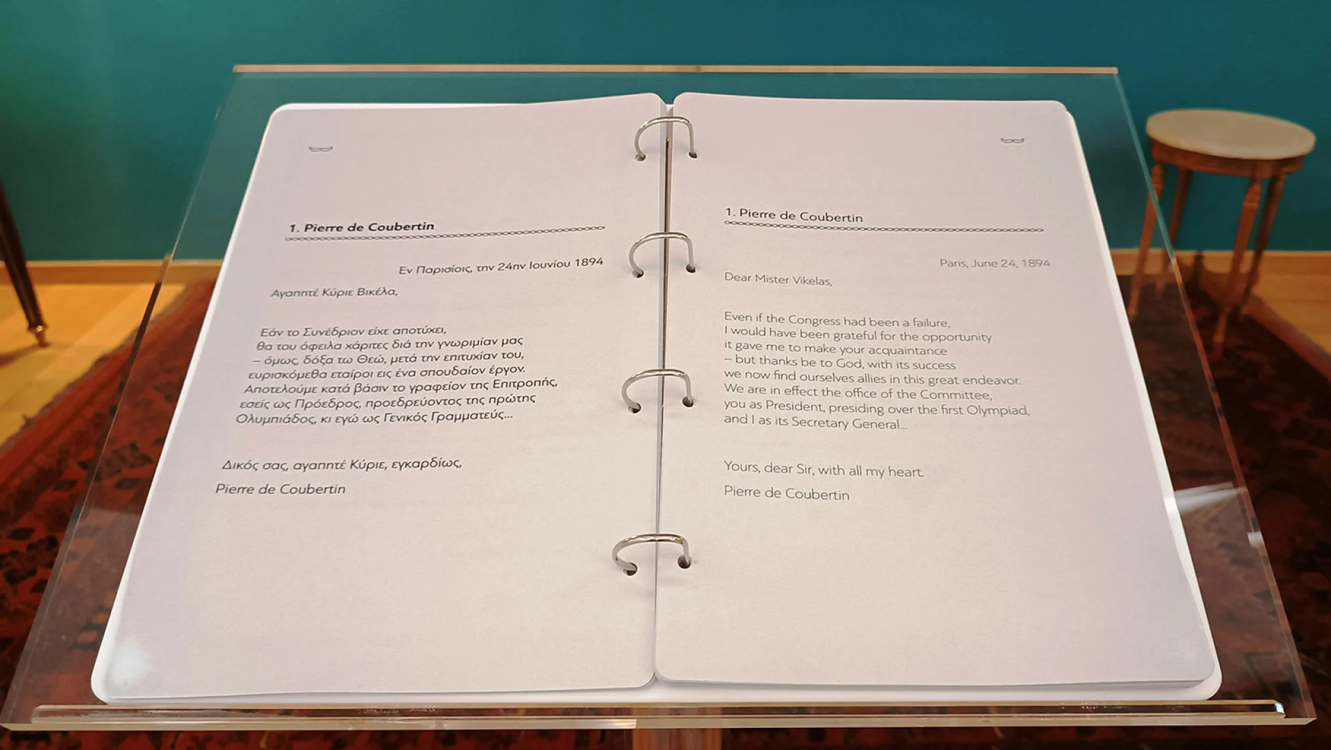 Ανάμεσα στα εκθέματα βρίσκονται συλλογές ολυμπιακών δάδων και μεταλλίων, αρχειακό υλικό, προσωπικά αντικείμενα αθλητών, τεκμήρια συλλεκτών, η συλλογή «ΑΘΗΝΑ 2004», καθώς και κομμάτια από τις στολές της τελετής έναρξης. Ιδιαίτερη θέση έχει το γραφείο του Δημητρίου Βικέλα, πρώτου προέδρου της ΔΟΕ, καθώς και οι δραματοποιημένες επιστολές που αντάλλαξε με τον Πιερ ντε Κουμπερτέν.