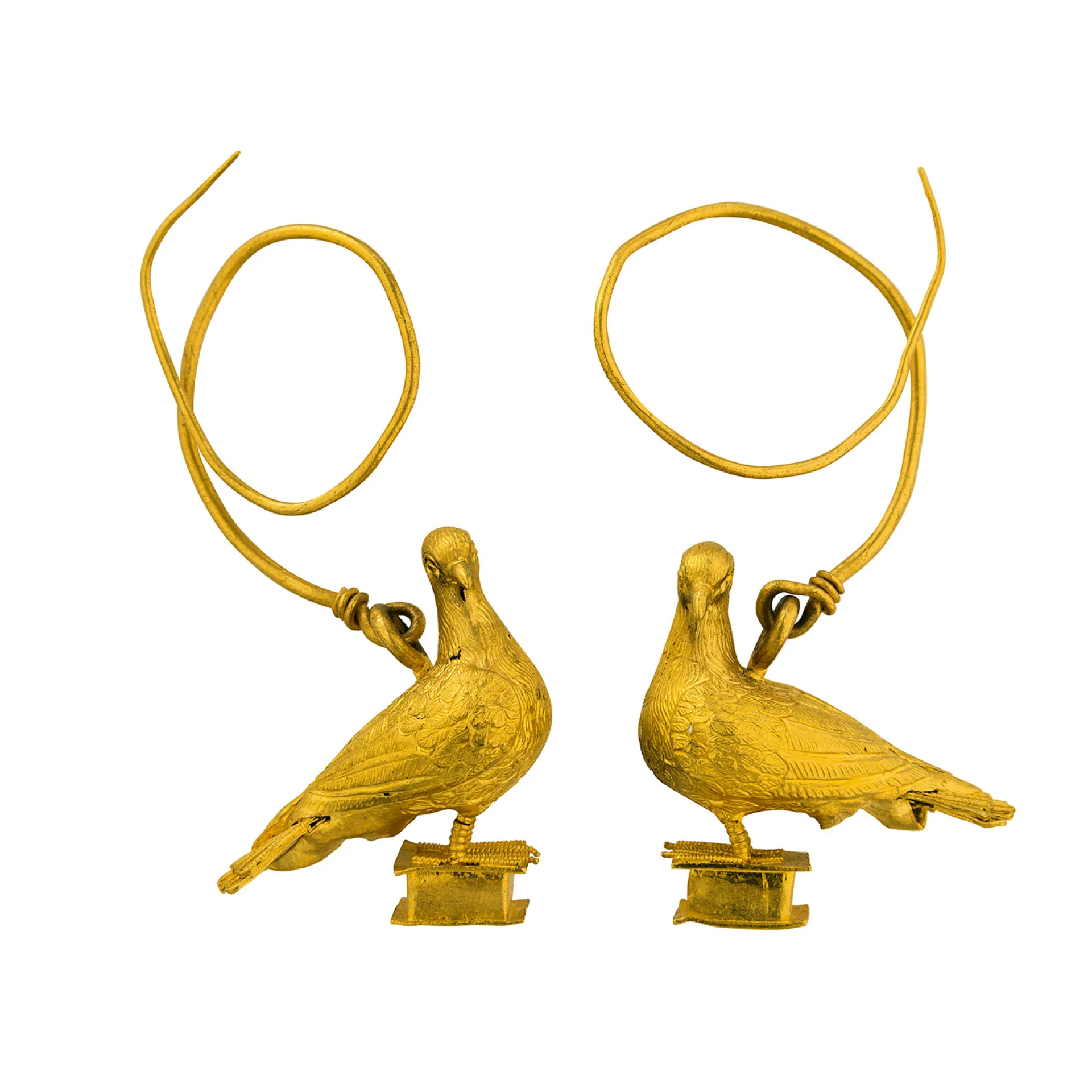 Ζεύγος χρυσών ενωτίων με τη μορφή περιστεριών που πατούν σε πλίνθο. Πάτρα, τέλη του 2ου – αρχές του 1ου αι. π.Χ. © Lamda Development