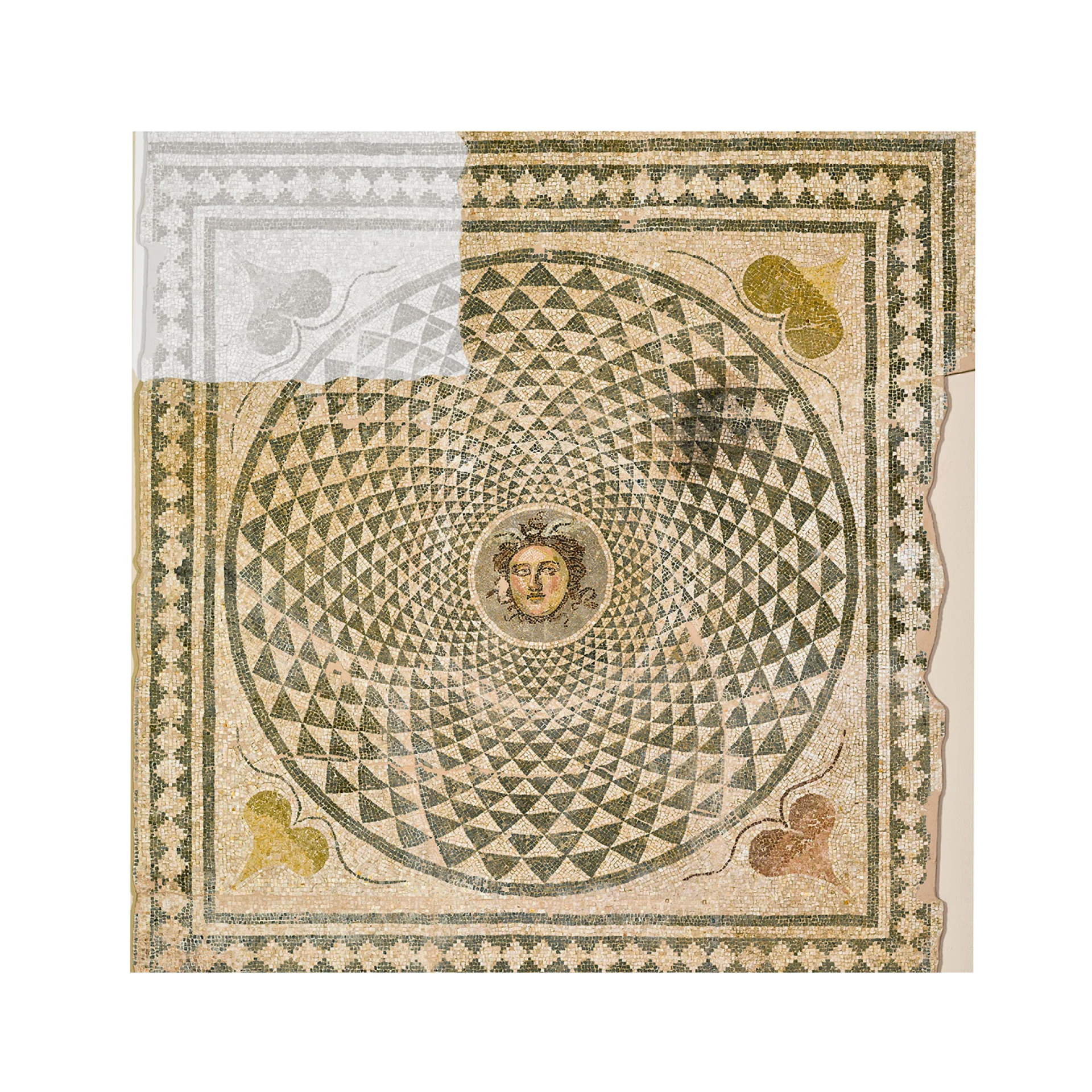 Ψηφιδωτό δάπεδο με την κεφαλή της Μέδουσας σε μεγάλο και πολυτελές κτιριακό συγκρότημα της Πάτρας. Η Μέδουσα αποδίδεται με ήρεμα χαρακτηριστικά, αποστρέφοντας το βλέμμα για να μην πετρώσει τον θεατή. 2ος αι. μ.Χ. © Lamda Development