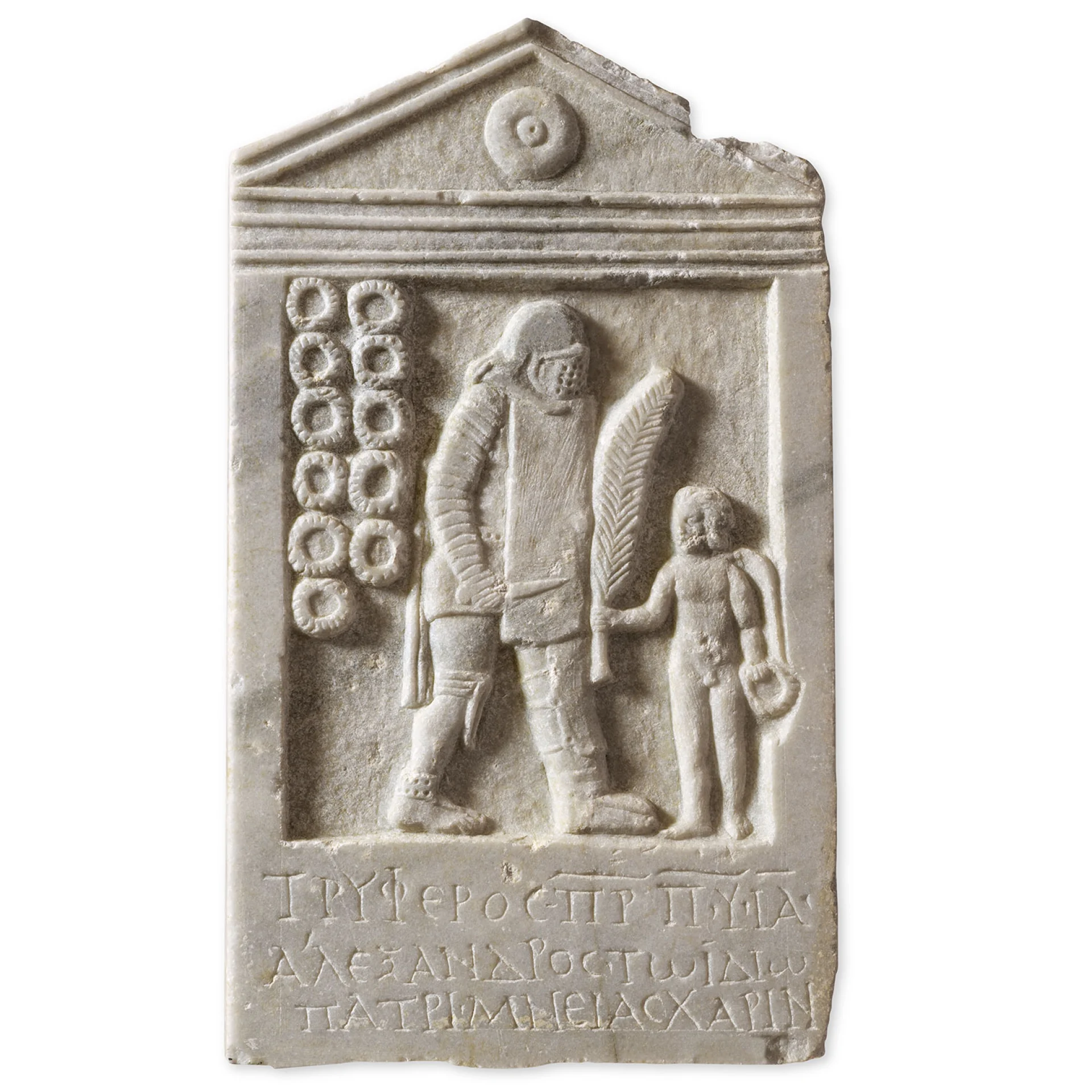 Μαρμάρινη επιτύμβια στήλη του μονομάχου Τρύφερου, την οποία προσέφερε στη μνήμη του ο γιος του, Αλέξανδρος. Ο μονομάχος, βαριά οπλισμένος στον τύπο του διώκτη, στρέφεται προς τα δεξιά. Αριστερά, έντεκα στεφάνια συμβολίζουν τις νίκες του στον στίβο. Πάτρα, Βόρειο νεκροταφείο, 2ος-3ος αι. μ.Χ. © Lamda Development