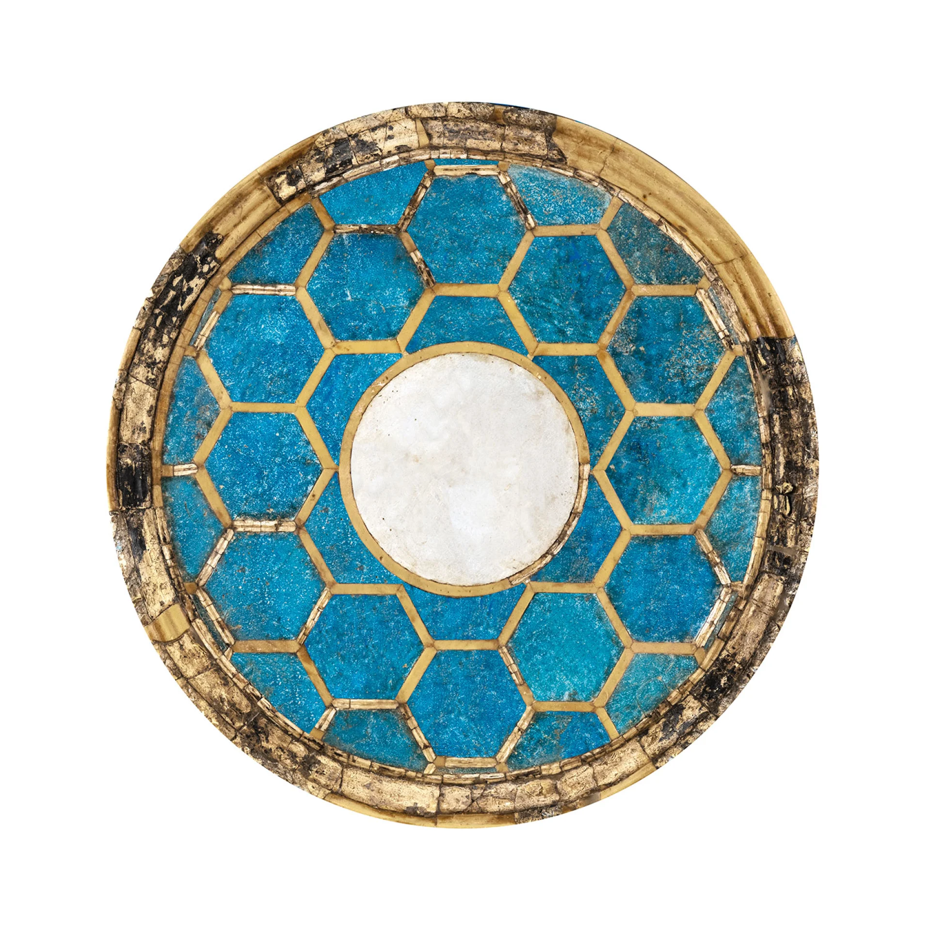 Πολυγωνικό υαλόφραγμα παραθύρου από πολυτελή αστική κατοικία της ρωμαϊκής πόλης των Πατρών. Ελεφαντοστέινα διάχωρα συγκρατούν το αδιαφανές γαλάζιο γυαλί. Το κεντρικό κυκλικό τμήμα καλύπτεται με φίλντισι. 2ος αι. μ.Χ. © Lamda Development