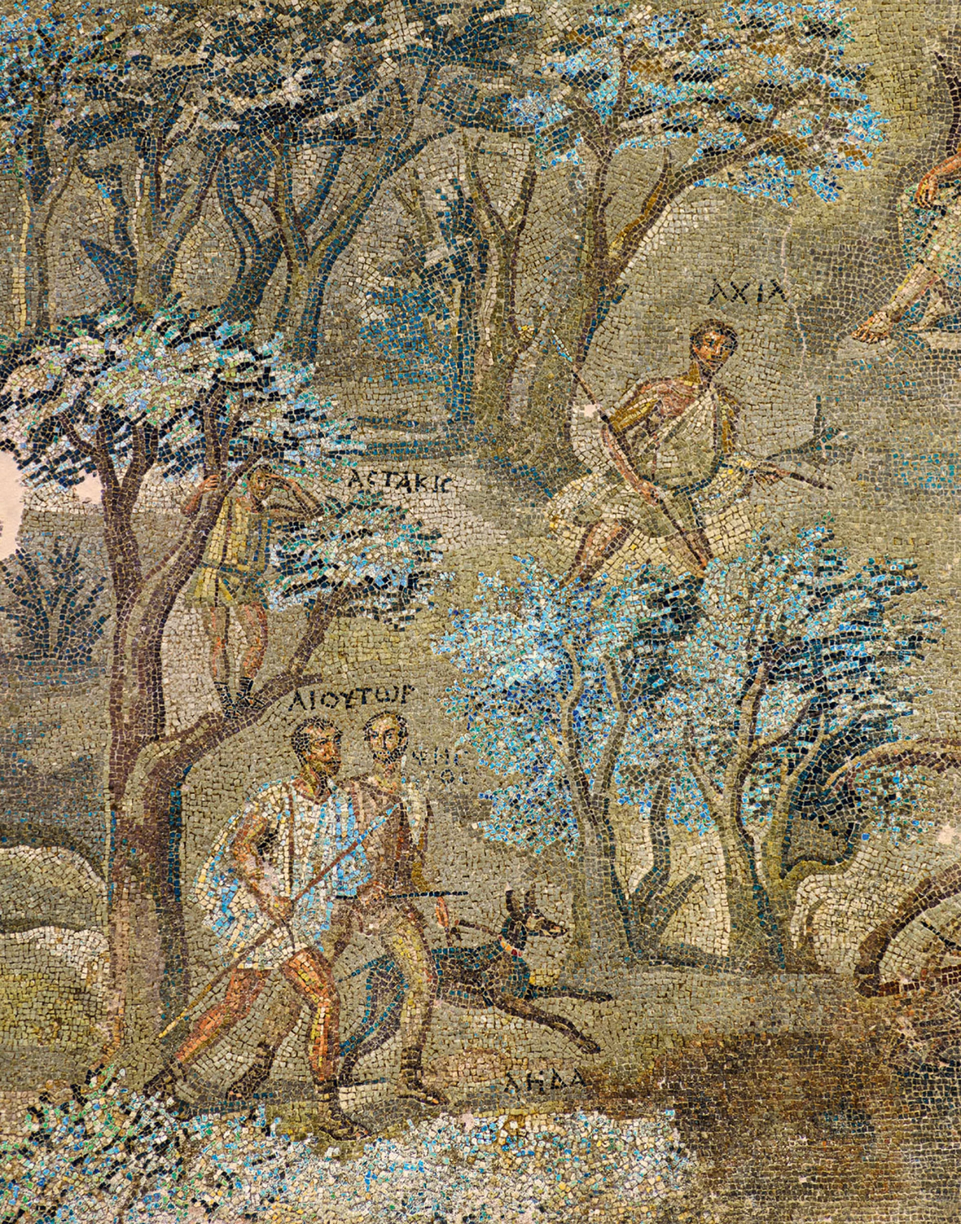 Ψηφιδωτό δάπεδο μεγάλης και πλούσιας ρωμαϊκής έπαυλης, από τα μεγαλύτερα που έχουν εντοπιστεί στην Πάτρα. Στην παράσταση –με θέμα το κυνήγι– έχουν χρησιμοποιηθεί πολύ λεπτές ψηφίδες που ανακαλούν ζωγραφική σύνθεση, ενώ οι επιγραφές ονομάτων πιστοποιούν ότι πρόκειται για ρεαλιστική σκηνή. Έργο υψηλής καλλιτεχνικής αξίας από αξιόλογους τεχνίτες. Τέλη του 3ου – αρχές του 4ου αι. π.Χ. © Lamda Development