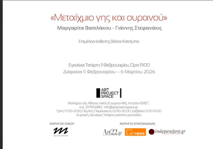 Το Art Project Space παρουσιάζει την εξαιρετική διατομική έκθεση της Μαργαρίτας Βασιλάκου και του Γιάννη Στεφανάκι με τίτλο “Μεταίχμιο γης και ουρανού”