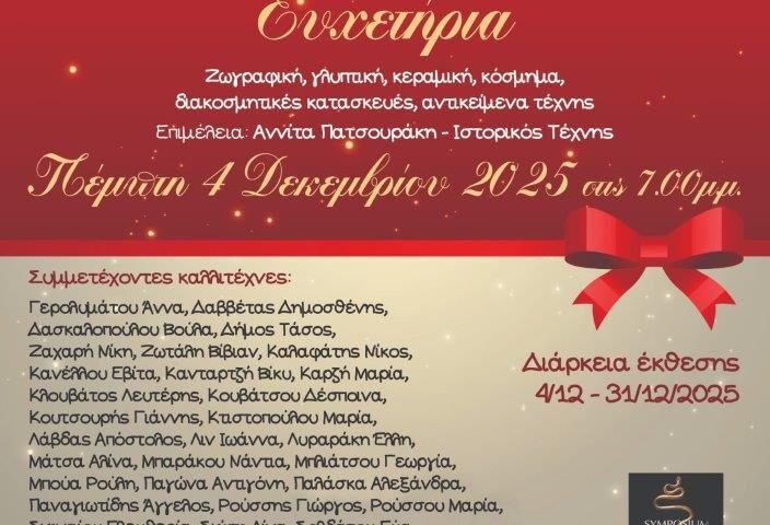 Andieart gallery «Ευχετήρια» / Eορταστική, εικαστική, ομαδική έκθεση Πέμπτη 4 Δεκεμβρίου 2025, στις 7μ.μ., Μοναδικά έργα τέχνης ζωγραφικής, γλυπτικής, κεραμικής, κοσμήματα, διακοσμητικές κατασκευές και χειροποίητα χρηστικά αντικείμενα, σας υποδέχονται σε γιορτινό σκηνικό
